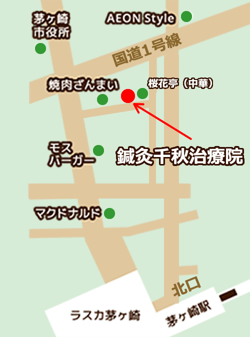 茅ケ崎駅北口より徒歩4分(駐車場は治療院の斜め前に1台あります)